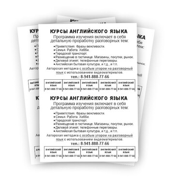 После печати мы разрежем их на необходимый размер. Если у вас нет макета, то наш дизайнер поможет вам в его создании, по минимальным ценам.
